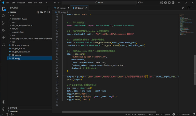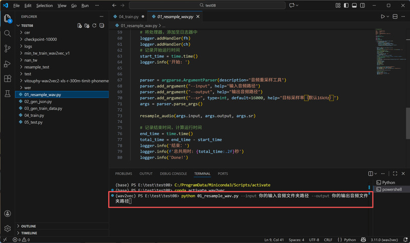 1. 音频转采样率:因Wav2Vec 2.0底座模型的输入要求,非16KHz采样率音频需通过脚本统一转换,确保与底座模型兼容。
