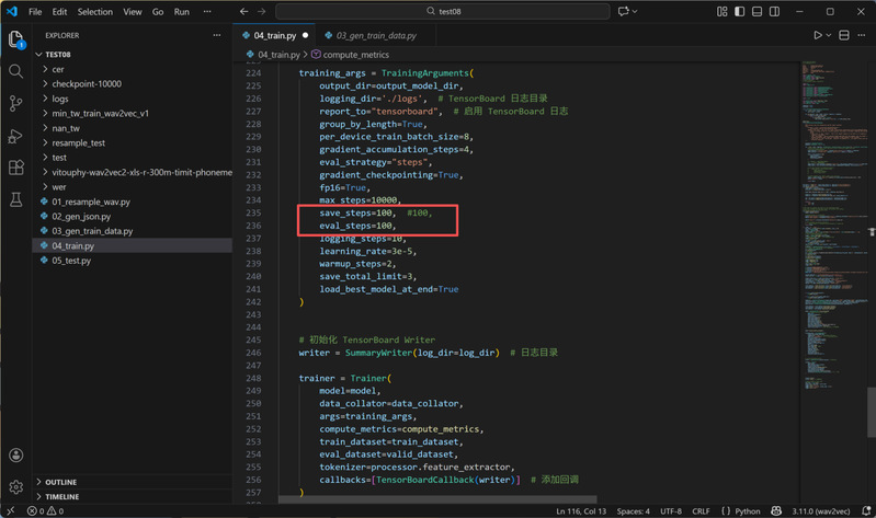 4. 执行训练脚本:这是本次IPA模型训练的核心环节。基于Wav2Vec 2.0底座模型进行微调,通过CTC损失函数优化,支持断点续训(指定检查点路径即可恢复训练),并默认保留验证集loss最优的3个模型。在此环节中,邵老师特别提示:训练时长与硬件配置强相关;训练过程需重点关注词错误率(WER)和字符错误率(CER),模型初始错误率通常为100%,约3000个epoch后开始显著下降,1万epoch时CER可降至18%,表明模型已稳定收敛。普通电脑若想快速观察训练趋势,可将脚本中的评估步数从100步改为10步,每10步输出一次loss值。