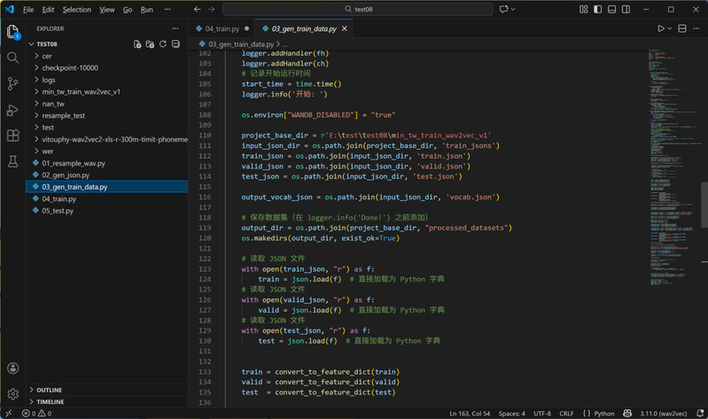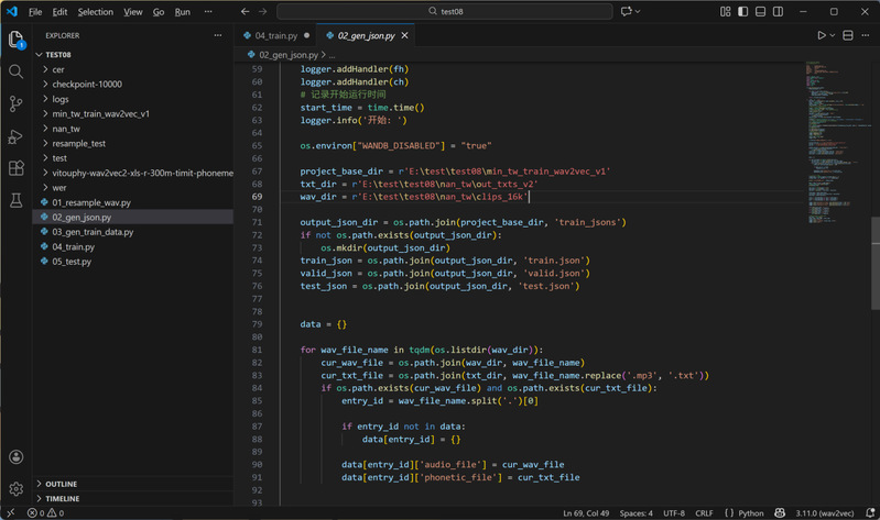 2. 生成JSON配置文件:该步骤的核心作用是梳理音频与文本的对应关系,明确文件绝对路径,为后续数据加载提供规范索引。运行脚本后会自动统计训练集、验证集、测试集的时长分布,生成的JSON文件将明确每条样本的音频与文本绝对路径,为后续数据加载提供规范索引。学员使用时需注意修改脚本第67-69行的路径参数:第67行为项目基础目录(需手动创建),第68行为文本文件存储目录,第69行为16KHz音频文件存储目录。