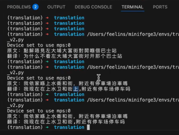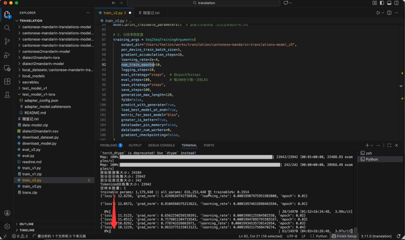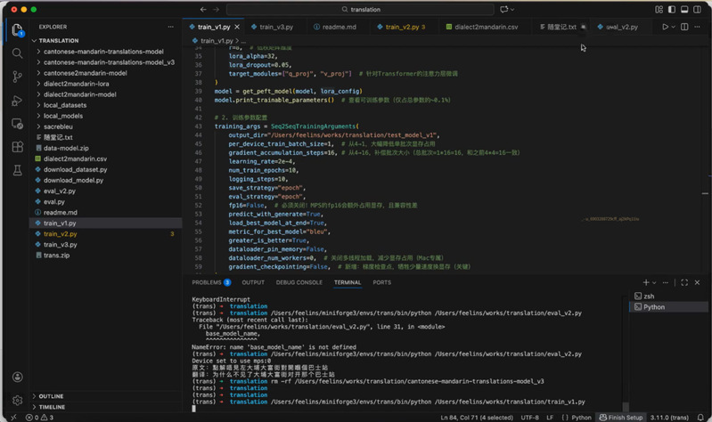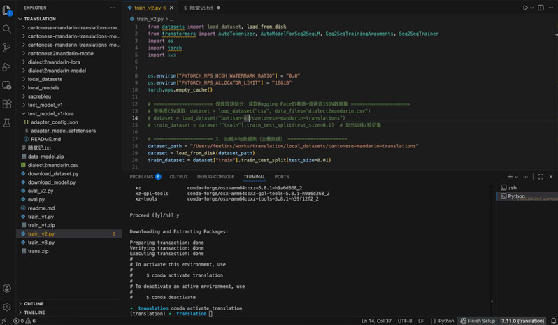 为了确保训练的稳定性,邵老师演示了如何跳过网络连接,直接加载本地下载好的Hugging Face数据集与模型文件。代码中特别展示了如何设置 PyTorch 的 MPS 环境变量,并通过local_datasets读取本地粤语-普通话(Cantonese-Mandarin)数据集的过程;下方的终端窗口则展示了 Conda 虚拟环境的安装与激活过程(conda activate translation),标志着模型训练前的环境准备工作完成。