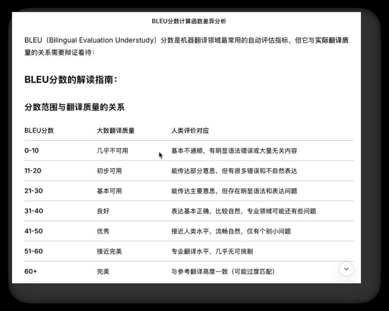 为了验证模型效果,邵老师介绍了BLEU分数这一评估指标。他指出,由于演示用的数据量较少,BLEU分数可能不会非常理想,但这恰恰展示了真实训练中的常态——数据量与质量直接决定翻译的上限。