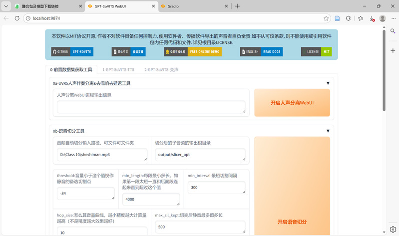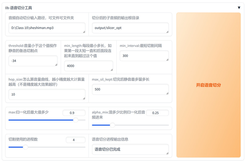 (1)音频切分:通过GPT-SoVITS的Web UI工具,输入长音频绝对路径,关键参数无需调整,可将长音频自动切分为短片段(过长会影响合成质量)。本次实操将28分钟的佘诗曼访谈音频切分为183条有效片段。