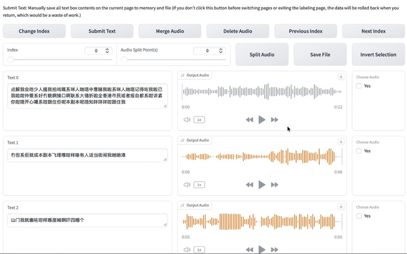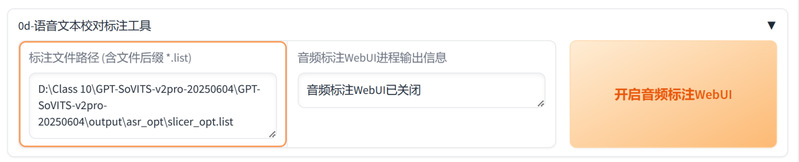 (3)人工校对:这是决定合成效果的关键步骤。完成语音识别后,点击“开启音频标注WebUI”可进行文本校对。学员需逐句对照音频与识别文本,删除非主要发音人的短片段等无关内容、修正转写错误,确保语料纯净性。