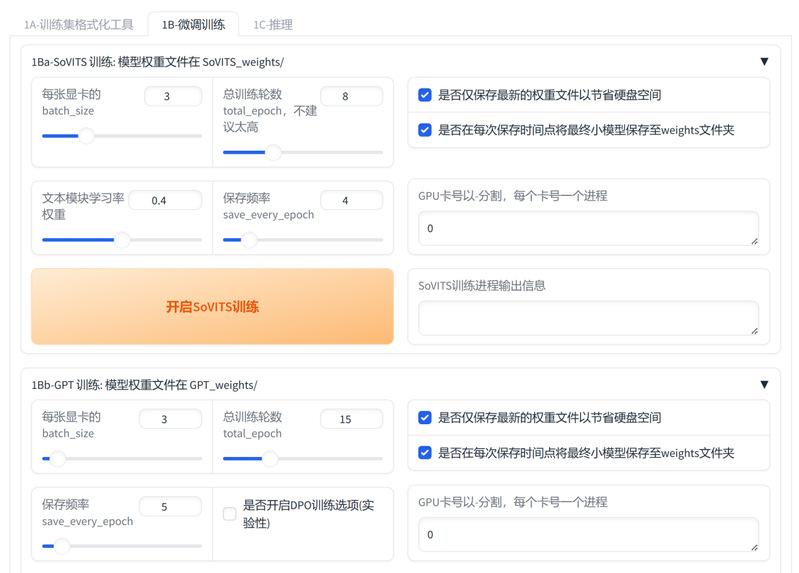 SoVITS训练聚焦方言发音学习,让模型掌握目标人物的音色特征。GPT训练专注韵律情感复刻,还原说话人的语调起伏与节奏习惯。两项训练均支持断点续训,且默认保留验证集loss最优的3个模型权重,方便后续调用。
